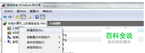 首先在开始菜单的搜索框中输入“高级安全windows防火墙”,然后打开它,接着鼠标右击入站规则选择“新建规则”项;