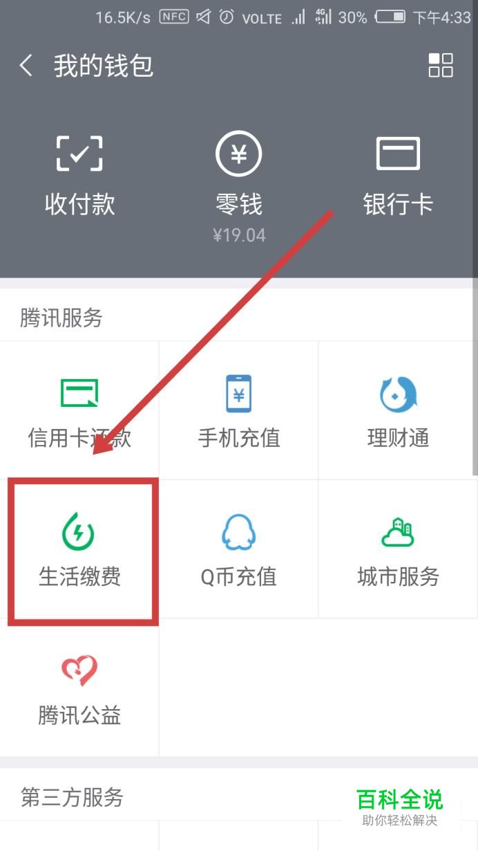 然后在“腾讯服务”中找到“生活缴费”,点击进入。