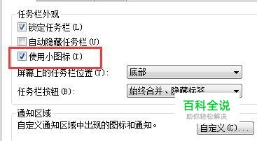 在菜单属性中,还可以查看其它属性,“使用小图标”,是将任务栏下的图标变小