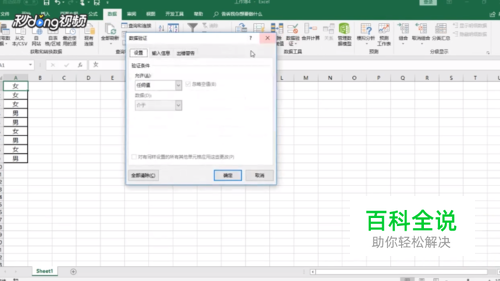 “允许”处选择“序列”,勾选右侧“提供下拉箭头”选项,在“来源”处输入“男,女”,点击“确定”,则该单元格内只能输入“男”或“女”。