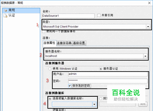在弹出的“报表数据源”对话框的“类型”处,选择“Microsoft Sql Client Provider”。输入SQL Server数据库服务器的名称或IP地址、连接数据库的用户名和密码,勾选“保存我的密码”,输入或者选择数据库名。如下图: