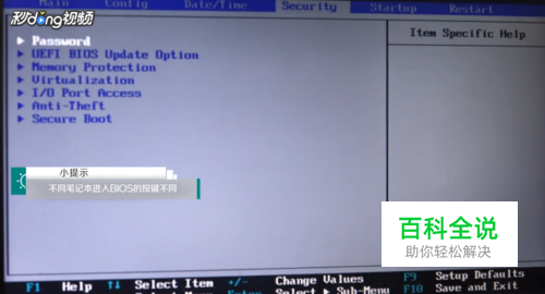 使用左右方向键进入“security”,选择“virtualization”,使其为“enabled”。