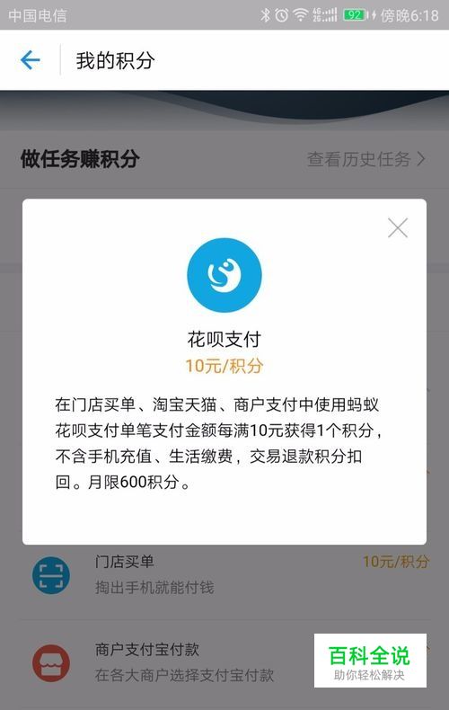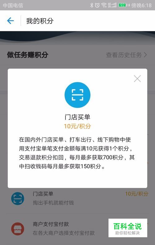 门店买单:10元/积分 在国内外门店买单、打车出行、线下购物中心使用使用蚂蚁花呗支付单笔支付金额每满10元获得1个积分,交易退款积分扣回,每月最多获得700积分,其中扫收钱码每月最多获得150积分。