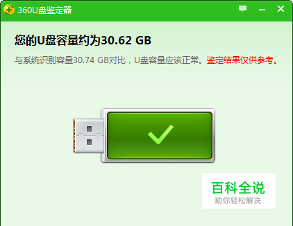 使用 360U盘鉴定器检验U盘,显示大小为30.62G,没有问题。