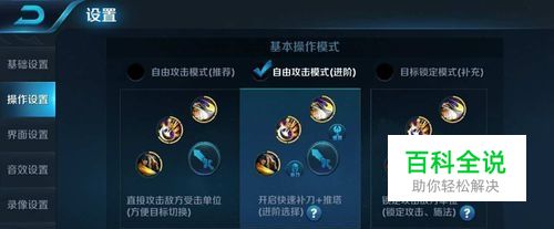 进入设置界面,可以看到其中包含许多游戏设置,选择操作设置,会发现三种操作模式。对于射手来说,我们通常选择进阶的自由攻击模式,也就是有补刀和推塔选项的。