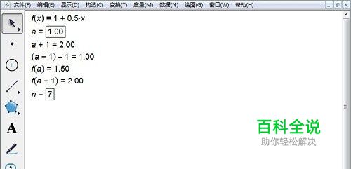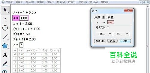 选择“数据”——“新建数函数”,在函数编辑器中依次输入“1”、“+”、“0”、“.”、“5”、“x”。选择“数据”——“新建参数”数值为“1”,单位“无”新建参数a=1,选择“数据”——“计算”,在函数编辑器中输入“a”、“+”,“1”、同样的方法计算a+1-1、f(a)、 f(a+1),同样的方法新建参数n=7作为迭代深度。 提示:1.计算a+1-1是为了得到f(a)的对应的横坐标。因为迭代次数为0的时候,f(a)=1.5,a的值在迭代数据表中是不会显示出来的。 2.输入函数计算时只需要在函数面板中点击函数表达式,在括号中点击a即可。