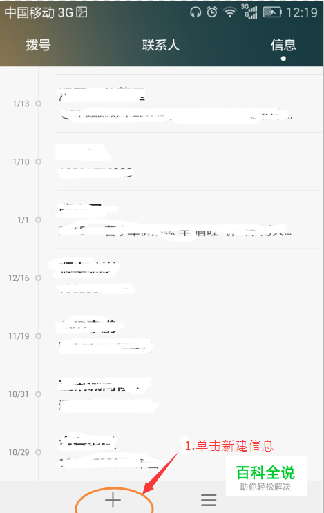 进入短信界面,单击“+新建信息”(图示1),单击“收件人”框,使方框内出现闪动光标,单击“收件人”框后面的图标(图示2)或者点击按键区域的数字按键(图示3)直接在收件人框内输入联系人电话号码(图示4)。