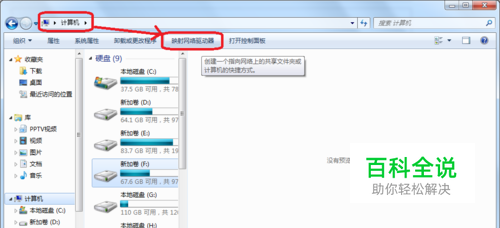 打开->计算机 在工具栏中选择 ->映射网络驱动器,弹出窗口如图