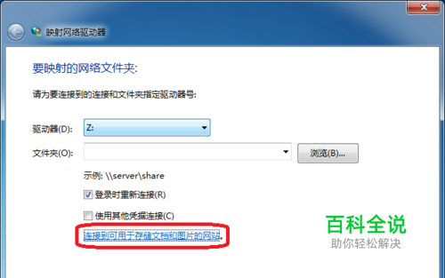 经过上一步弹出映射网络驱动器。在弹出的窗口中选择“连接到可用于存储文档和图片的网站”如图;选择完成出现下一个窗口直接下一步。