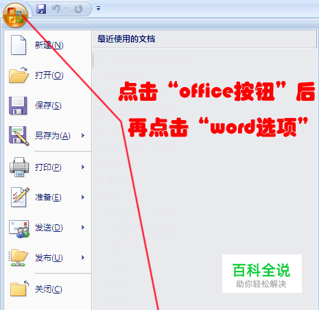 点击“office”按钮,然后点击右下角的“word选项”,如下图所示: