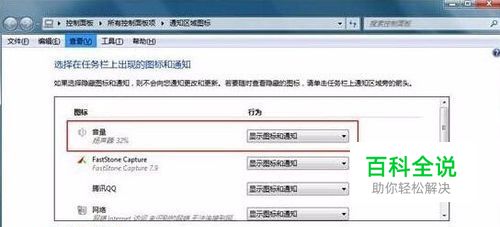 2.在通知区域图标里面,找到音量图标,将它的行为改为“显示图标和通知”点击确定完成操作。如下图所示