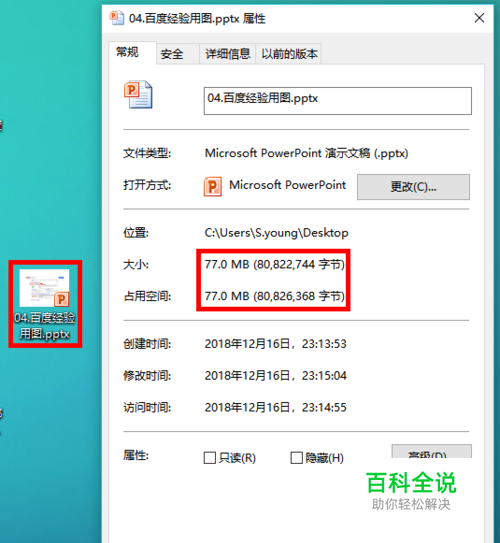 咱们来做个对比试验,在压缩PPT之前查看PPT的属性,案例中PPT的属性为77M,超过了20M。