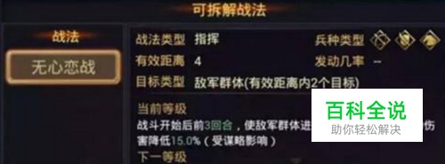 战必断金简评:很多人一定认为这个技能应该跟反计之策平起平坐,但实际并不是这样,他的实用效果远远不及反计之策。原因就是菜刀队实在太难配齐,导致打仗时是很难遇到菜刀队的。所以将它的排名降低了不少。(这个可能争议较大,期待不同观点)