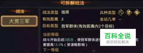 大赏三军简评:加成伤害技能,相对来说更适合菜刀队,但相对于避其锋芒等来说却受到反计之策,战必断金之类的克制,直接把效果几乎完全抹杀了。所以排名不如减伤类。