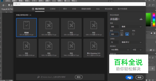 打开PS,按住Ctrl+N新建一个文件,将宽度和高度设置为五百像素,其它采用默认设置。