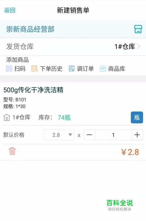 单位:崇新商品经营部, 商品:500g传化干净洗洁精, 计量单位:瓶 售价:2.8 此时,手机开单,选该往来单位、该商品且计量单位选择“瓶”,则带出价格2.8。如下图: