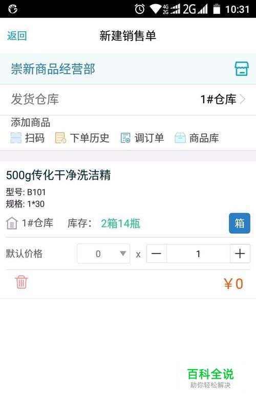在手机端开单,选择如下: 单位:崇新商品经营部, 商品:500g传化干净洗洁精, 计量单位:瓶 仓库:1#仓库 带出商品价格如下图: