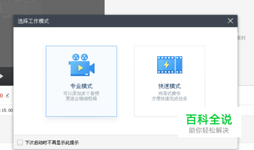 首先启动快剪辑软件,点击新建项目,从弹出选择工作模式对话框中选择专业模式。
