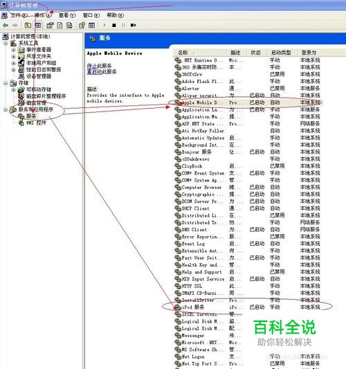 2、右键点击 我的电脑(计算机)-管理-服务(服务和程序),停止并重启Apple Mobile Device和iPod Service(iPod服务);