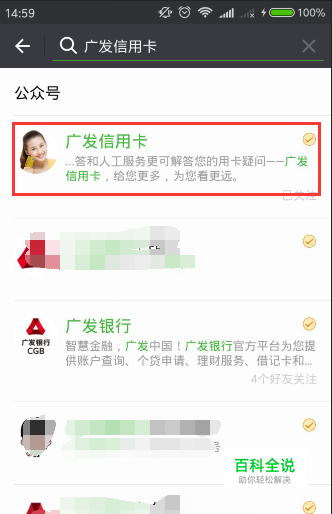 然后输入关键字“广发信用卡”,点击确定搜索,一般第一个搜索结果就是要找的。注意查看详情的公司信息,确定是广发官方的公众号