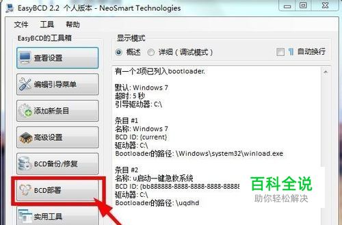 切勿直接删除deepin所在的分区,这样会搞坏grub,使得无法正常进入Windows。 首先使用EasyBCD修复MBR。 点击BCD部署。