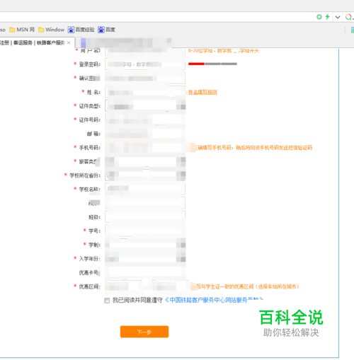 填好之后看一遍,然后点击,我已阅读并同意遵守 《中国铁路客户服务中心网站服务条款》,下一步。