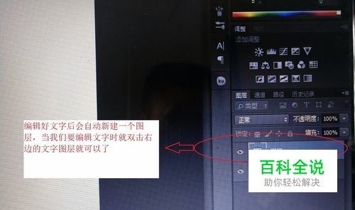 第二步,编辑文字。这一步比较重要,编辑文字的前提是要选中文字,怎么选中文字呢?当我们编辑好文字后会自动新建一个图层,当我们要编辑文字时就双击右边的文字图层就可以了。