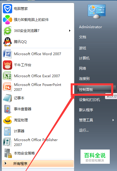 首先点开开始菜单,找到控制面板按钮