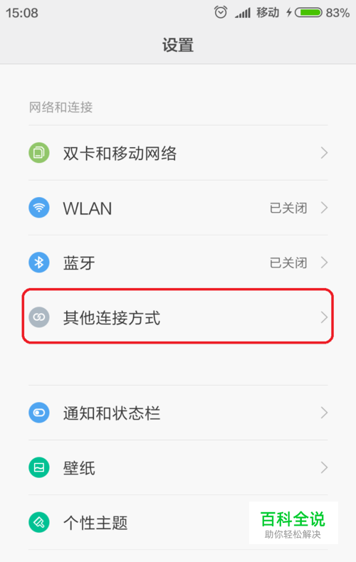 打开安卓设置界面如图,单击进入网络和连接下的“其他连接方式”项;