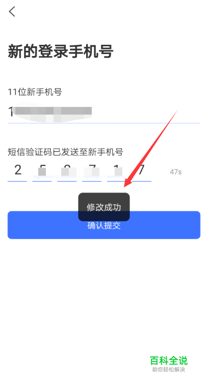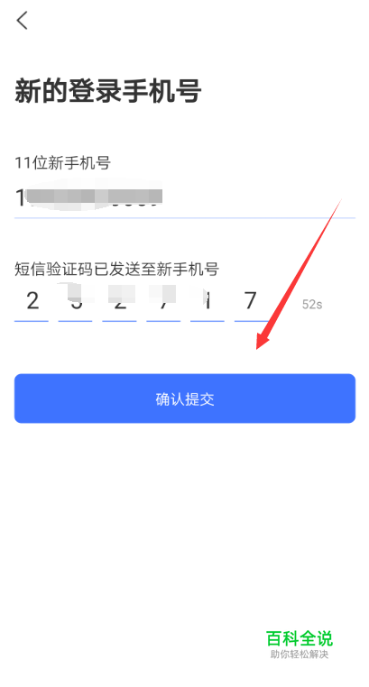 人脸识别成功后,直进入新的登录手机号输入界面,直接输入新手机号,然后获取验证码,然后点击【确认提交】,如下图所示。