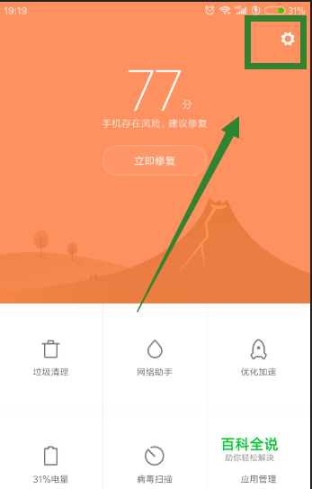 首先我们打开我们手机安全中心,这个软件是手机自带的安全防卫软件,每个手机都有的,然后点击有上角的设置功能。