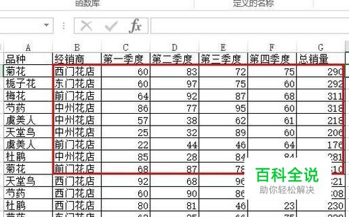 首先要确定好目标,我们要查找”西门花店“的总销量,于是先在总销量的后面选中一个单元格,然后点击工具栏的”公式“,接着点击“插入函数”。