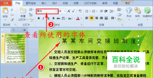 首先打开PPT文件,点击一下幻灯片中的内容,查看自己PPT现在使用的是什么字体。如图所示: