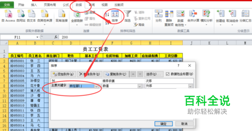 要求以所在部门为分类字段,对工资总额进行分类汇总。 光标定在数据表中,单击数据-排序。在弹出的窗口中主要关键字选择“所在部门”,其它值为默认。