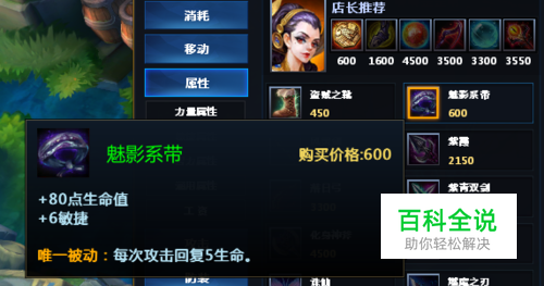我们在出装的时候,开始可以先出一个魅影系带,可以增加80点生命值和6点敏捷,而且还可以回复生命值,对于开局非常的必要,如图所示。