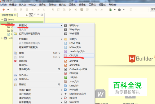 在新创建的demo项目中,有一个 css文件夹,里面并没有文件,这时我们创建一个css文件 ,创建的步骤: 右键CSS文件 →新建→CSS文件。