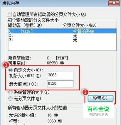 在“自定义大小”中调整虚拟内存为您实际内存的1.5倍到2倍。点击设置重启电脑即可。