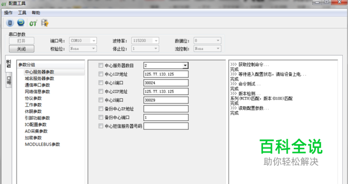 DTU掉线重连间隔配置 前提:为那DTU采用的是双串口的通信模式,调试串口与通信串口分离。请将串口接到为那DTU调试串口。 1,打开配置工具configtool,->1,按照顺序选择相对应的串口号,2-6按照默认设置,7打开串口。如图: 2,按照提示给设备上电,如果已经上电请重新上电。进入配置状态。如图: 3,基本配置DTU服务器中心1IP地址和备份中心或是域名地址及端口号配置,如图: 4,配置DTU重连时间间隔和重连时间次数:(一般以默认值为准,如果特殊需求可自定义修改) 5,保存参数,重启设备 测试步骤: 在正常通信过程中,断开中心地址1服务端口,查看DTU重新连接备用中心过程时间。