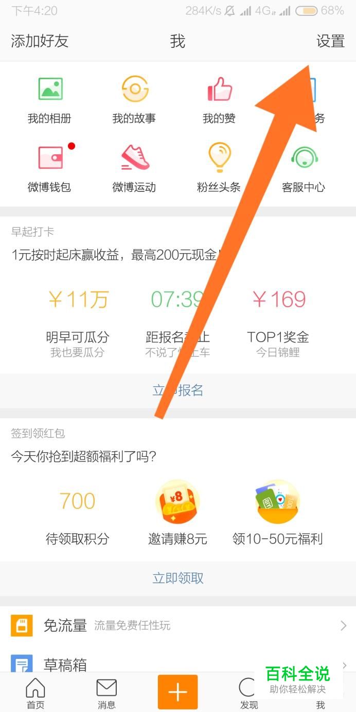 首先进入手机微博客户端页面“我”,然后点击右上角的“设置”字样。