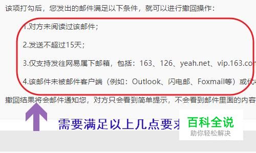 首先,网易邮箱是支持邮件撤回的,不过需要满足几点条件才行,比如说对方未读邮件内容、发送不超过15天、以及邮件未被第三方邮件客户端代收,如图所示...