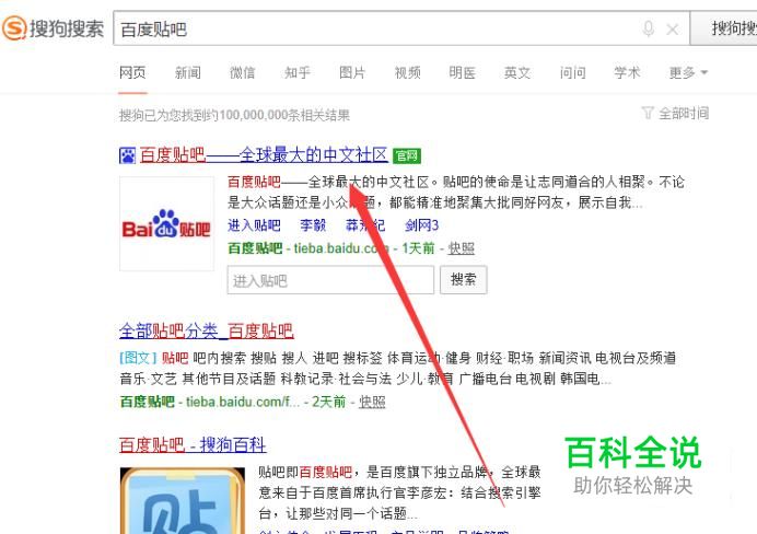 打开电脑,进入搜狗搜索,搜索“百度贴吧”,点击并进入,如图所示。