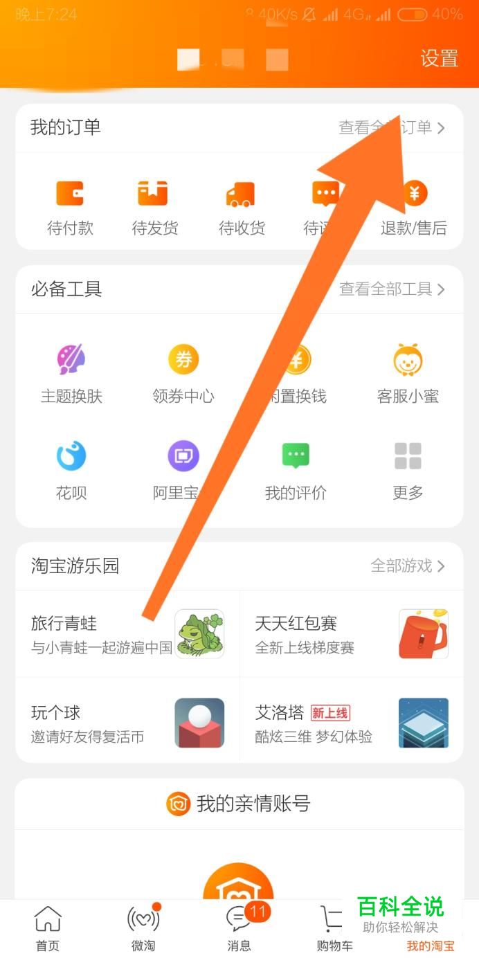 首先进入手机淘宝页面“我的淘宝”,然后点击右上角的“设置”字样。