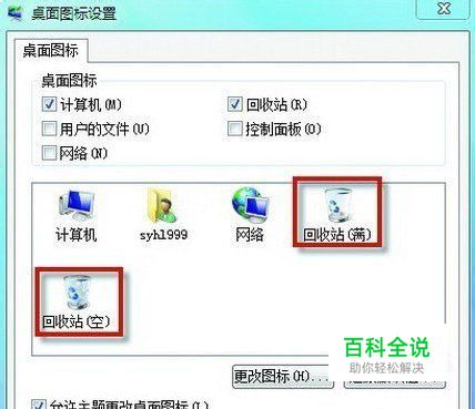 再分别选中图中错误的“回收站(满)”和“回收站(空)”图标,单击“更改图标”按钮,在打开的同名对话框中,重新选择正确的回收站满和空的图标;最后单击图中的“应用”和“确定”按钮就可以了