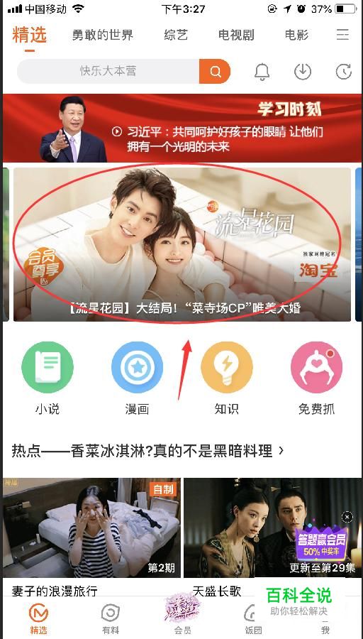 首先,在手机上打开芒果tv的APP,点进去,如图进入首页,选一个视频点进去(随意选想看什么视频,我选的是流星花园)