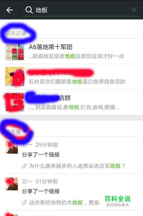 输入你要搜索的内容,比如输入地板,就会出来和地板有关的一切消息,包括聊天记录,你发的朋友圈信息,或是别人发的朋友圈信息。