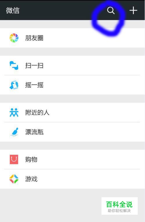 打开微信,找到搜索的标志,就是下图中蓝色圈住的地方,点开