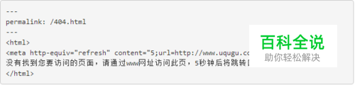 继续编辑该404文件,在文件头部添加YAML前标记,为预定义变量赋值,告诉系统该自定义404文件作为404文件使用。 --- permalink: /404.html ---