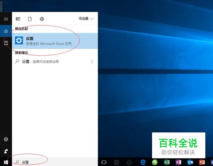 如图所示,搜索框输入"设置"。Cortana(小娜)显示搜索结果,点击"最佳匹配→设置"项。