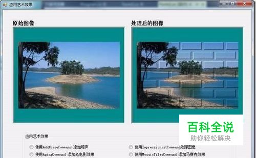 双击radioButton8,在radioButton8 CheckedChanged事件句柄中添加以下代码: (本段代码为MosaicTilesCommand类的使用) 1: temp = beforePic.Image.Clone(); 2: 3: MosaicTilesCommand command = new MosaicTilesCommand(); 4: command.BorderColor = new RasterColor(0, 0, 0); 5: command.TilesColor = new RasterColor(255, 255, 255); 6: command.TileWidth = 50; 7: command.TileHeight = 50; 8: command.Opacity = 50; 9: command.ShadowThreshold = 50; 10: command.ShadowAngle = ShadowCommandAngle.East; 11: command.PenWidth = 7; 12: command.Flags = MosaicTilesCommandFlags.Cartesian |MosaicTilesCommandFlags.ShadowGray; 13: command.Run(temp); 14: afterPic.Image = temp;
