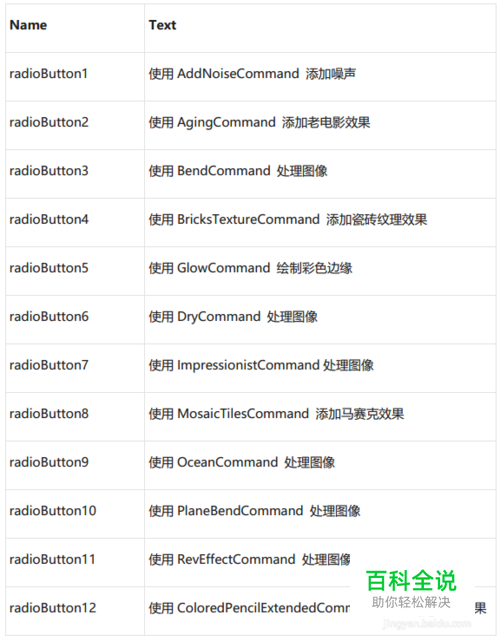 双击radioButton7,在radioButton7 CheckedChanged事件句柄中添加以下代码: (本段代码为ImpressionistCommand类的使用) 1: temp = beforePic.Image.Clone(); 2: 3: ImpressionistCommand command = new ImpressionistCommand(); 4: command.HorizontalDimension = 10; 5: command.VerticalDimension = 10; 6: 7: command.Run(temp); 8: afterPic.Image = temp;